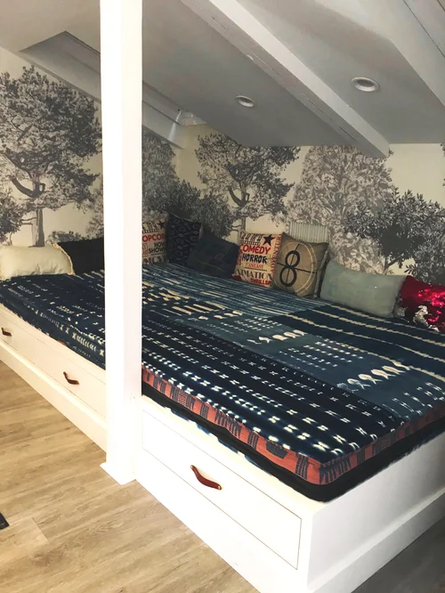Custom Bunk beds commissioned by Dee Murphy Design for the One Room Challenge. Beds are complete with under storage as well as a hanging open closet at the foot of the beds.