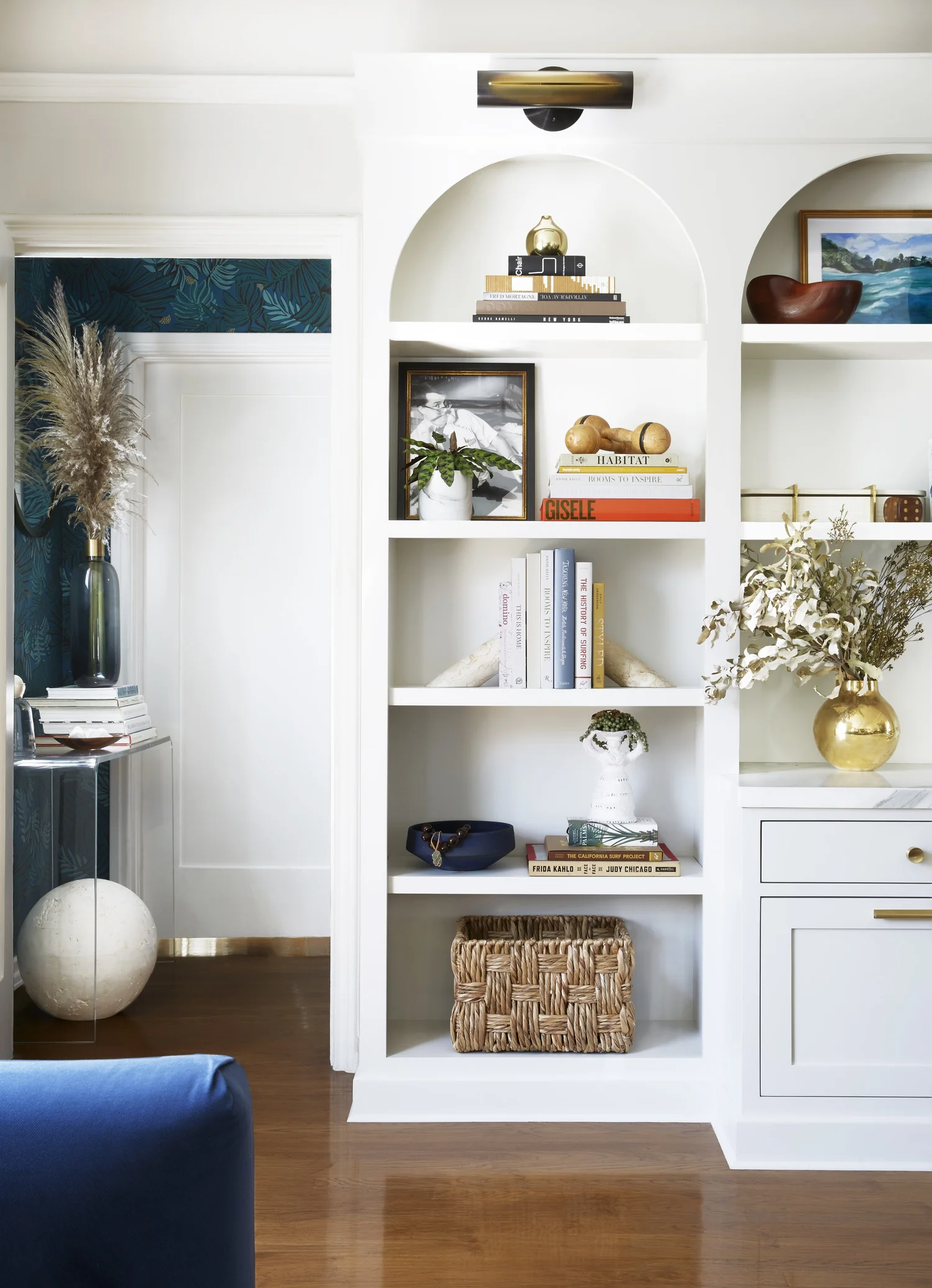 Close-up view of rounded arch shelf in hanging closet